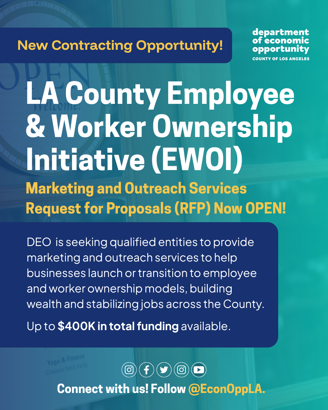 DEO has opened a Request for Proposals (RFP) to select a Marketing Service Provider to lead outreach and communications for the County’s Employee and Worker Ownership Initiative.
