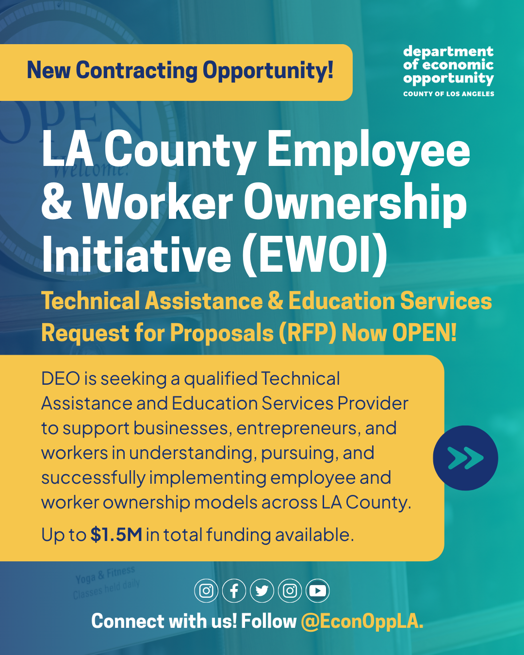 The EWOI is a key strategy for inclusive, community-rooted economic development in LA County and was created in response to a September 2023 motion introduced by the Los Angeles County Board Supervisors Holly J. Mitchell and Lindsey P. Horvath. This motion builds upon DEO’s Economic Mobility Initiative to support the startup and growth of local entrepreneurs, businesses, and nonprofits to start, grow, and stay in the County, including Employee Ownership LA County, an education and technical assistance pilot program.