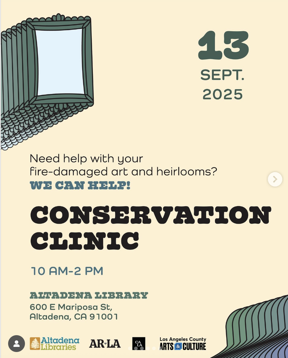 Need help with your fire-damaged art and heirlooms? We are here to help! Together with our friends LA County Arts and Altadena Library District, we are hosting a Conservation Clinic at the Altadena Library on Saturday, September 13, 2025.