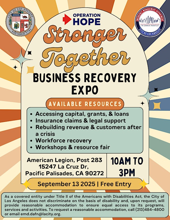 Stronger Together will be a vital gathering dedicated to supporting local businesses impacted by the 2025 Palisades Fire. This event brings together community leaders, recovery experts, government agencies, and business professionals to provide the resources, guidance, and support needed to rebuild, recover, and thrive.